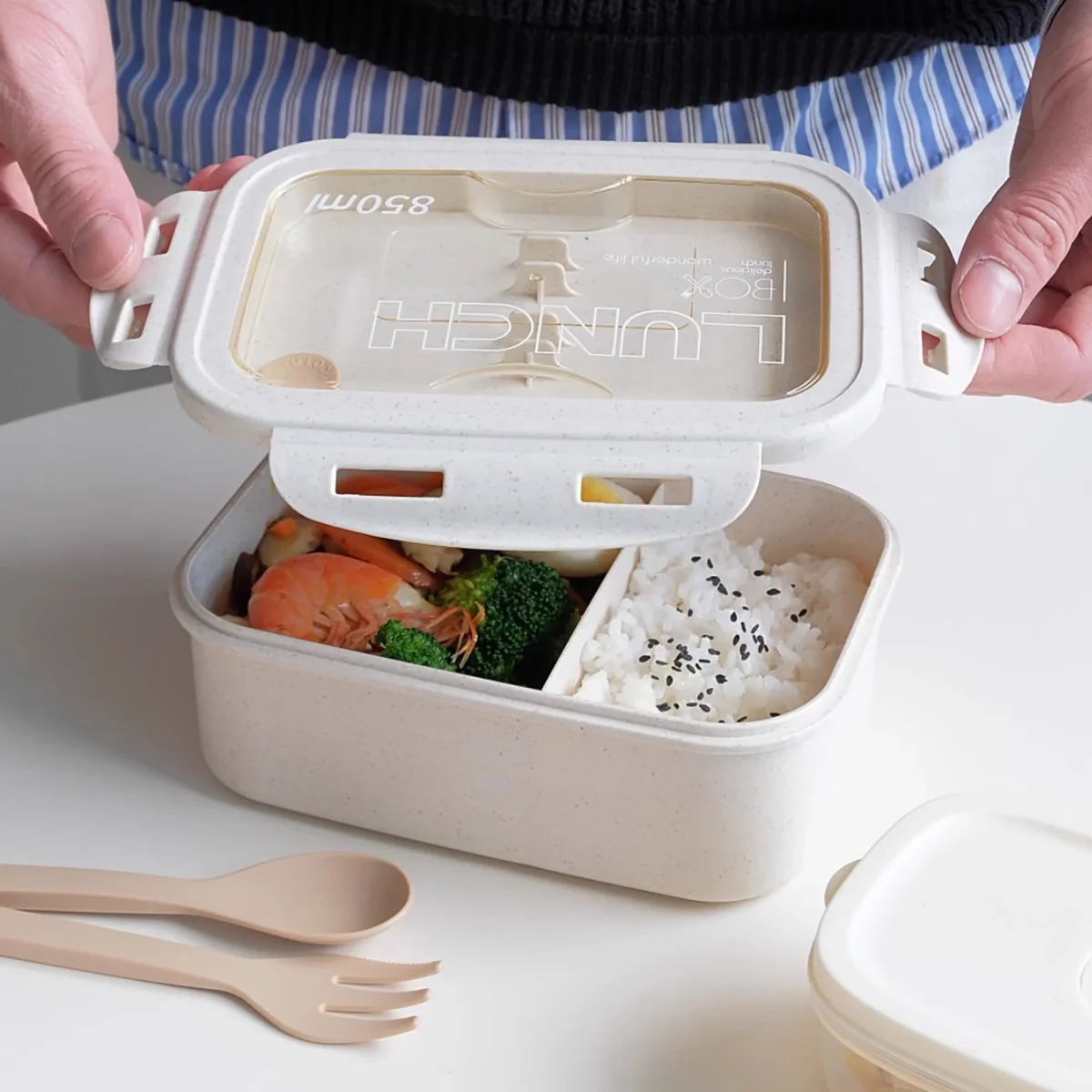 Cette boîte à bento spacieuse est dotée d’un couvercle hermétique avec un joint intérieur amovible, assurant une fermeture sécurisée et un nettoyage facile. Fabriquée en matériau écologique combinant fibre de blé et PP de qualité alimentaire, elle est hygiénique et simple à entretenir. Avec des séparateurs intégrés pour organiser vos aliments et un compartiment dédié aux couverts, elle est idéale pour les repas à emporter. Compatible avec le micro-ondes (sans couvercle, temps recommandé : moins de 2 minutes), elle est pratique et fonctionnelle. Apportez une touche de raffinement japonais à vos déjeuners ou pique-niques, parfaite pour un usage personnel ou comme cadeau.