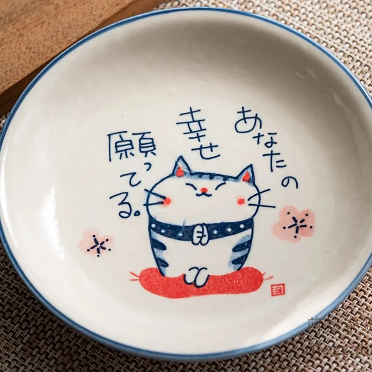 Cette assiette en céramique Seto-yaki est façonnée artisanalement au Japon et décorée avec une glaçure sans plomb cuite à haute température. Chaque modèle présente un chat priant peint à la main, symbole de chance et de bienveillance. Disponible en trois versions – « Apporte le bonheur », « Sourire au quotidien » et « Que le bonheur arrive » – elle apportera une touche de douceur poétique à votre table.