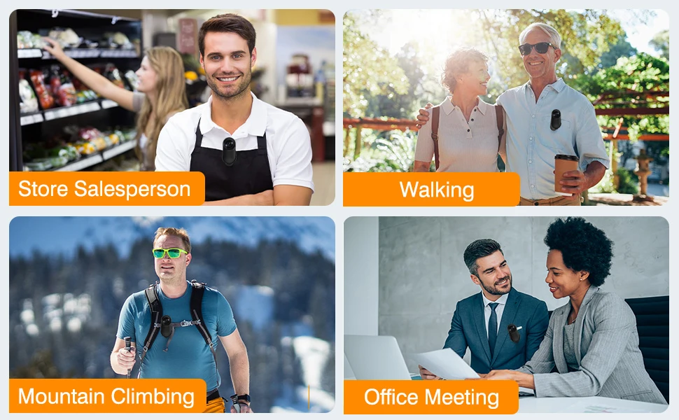 Vous pouvez clipser la caméra corporelle sur la poche, le collier, le sac à dos pour la randonnée, la marche, les réunions, le travail, les conférences et le vélo.