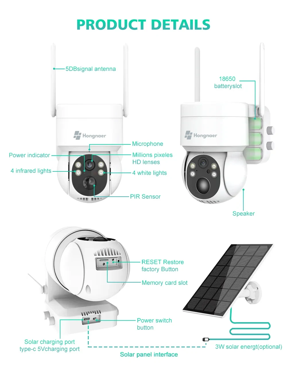 La résolution est de 4,0 m et l’image est claire et délicate. Les somatosensoriels PIR sont pris en charge. Peut être intégré dans 3 batteries au lithium 18650. Le réveil à distance de l’application est pris en charge. Soutenir la conversion jour-nuit. Alimenté par DC5V, soutenu par l’énergie solaire (un panneau d’énergie solaire externe est nécessaire). La connexion réseau WIFI est prise en charge. L’audio prend en charge la réduction du bruit 2D/3D et la grande dynamique numérique. Technologie avancée de compression vidéo H.265X, débit binaire ultra-faible, qualité d’image haute définition. Protection contre la foudre, conforme à la norme nationale GB/T17626.5, la norme internationale IEC61000-4-5. La surveillance mobile (iOS, Android) est prise en charge. Prise en charge d’une variété de technologies cloud, réalisation de la pénétration du réseau, poussée des messages d’alarme vers les téléphones mobiles et d’autres fonctions